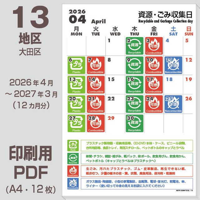大田区ゴミの日カレンダーPDF(2026年度版)-13地区