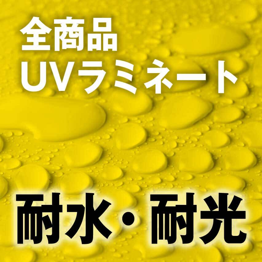 【高耐久の耐水シート】【色あせに強い溶剤インク】【表面のUVラミネート加工】により日光が当たる屋外でも長期使用が可能です。