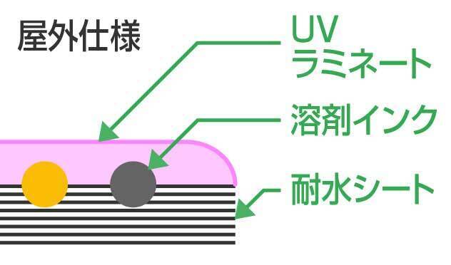 【高耐久の耐水シート】【色あせに強い溶剤インク】【表面のUVラミネート加工】により日光が当たる屋外でも長期使用が可能です。