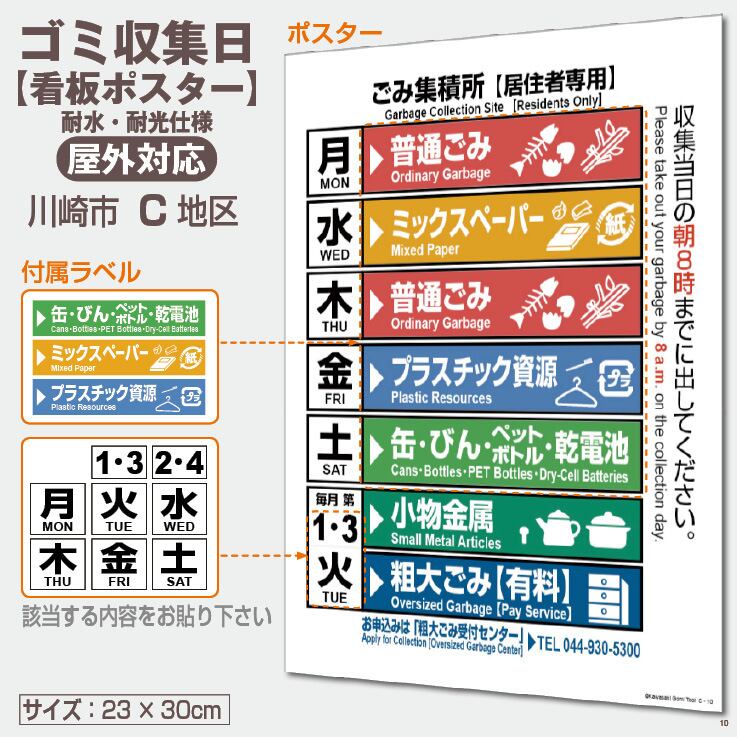 川崎市のゴミ収集日が一目で分かる耐候性【看板ポスター】です(ポスターと付属ラベルのセット)。付属ラベルから該当する内容を選び、ポスターに貼ってご利用下さい。