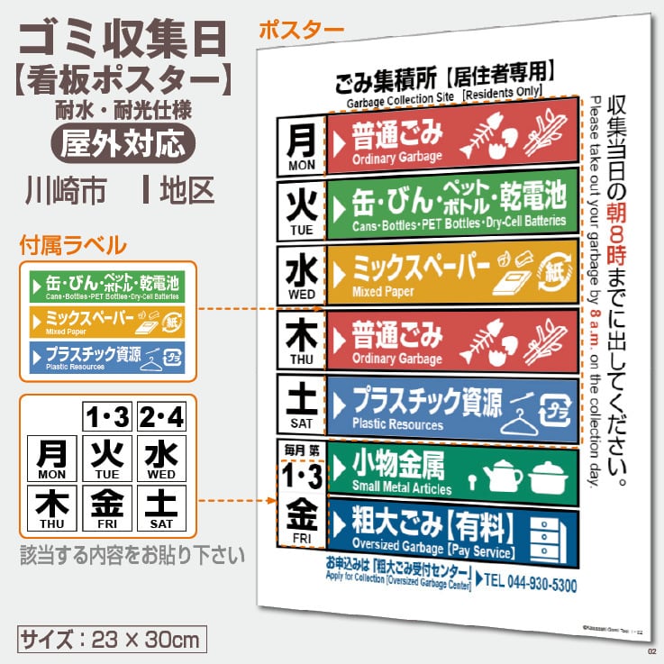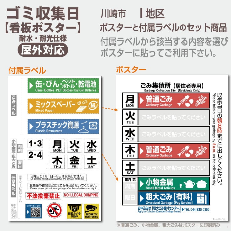 川崎市のゴミ収集日が一目で分かる耐候性【看板ポスター】です(ポスターと付属ラベルのセット)。付属ラベルから該当する内容を選び、ポスターに貼ってご利用下さい。