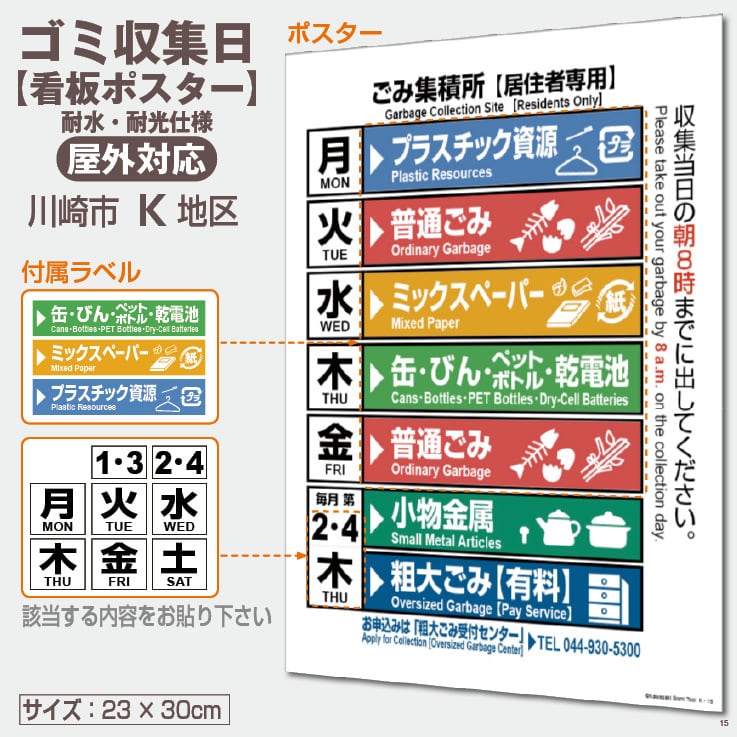川崎市のゴミ収集日が一目で分かる耐候性【看板ポスター】です(ポスターと付属ラベルのセット)。付属ラベルから該当する内容を選び、ポスターに貼ってご利用下さい。