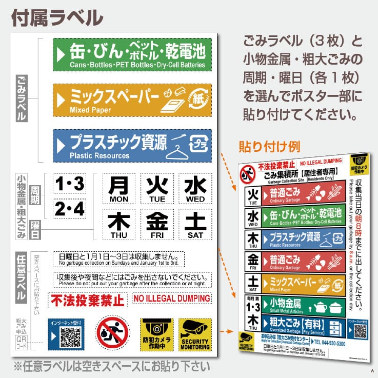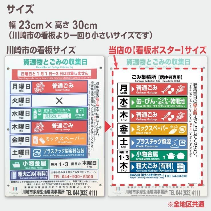 川崎市のゴミ収集日が一目で分かる耐候性【看板ポスター】です(ポスターと付属ラベルのセット)。付属ラベルから該当する内容を選び、ポスターに貼ってご利用下さい。
