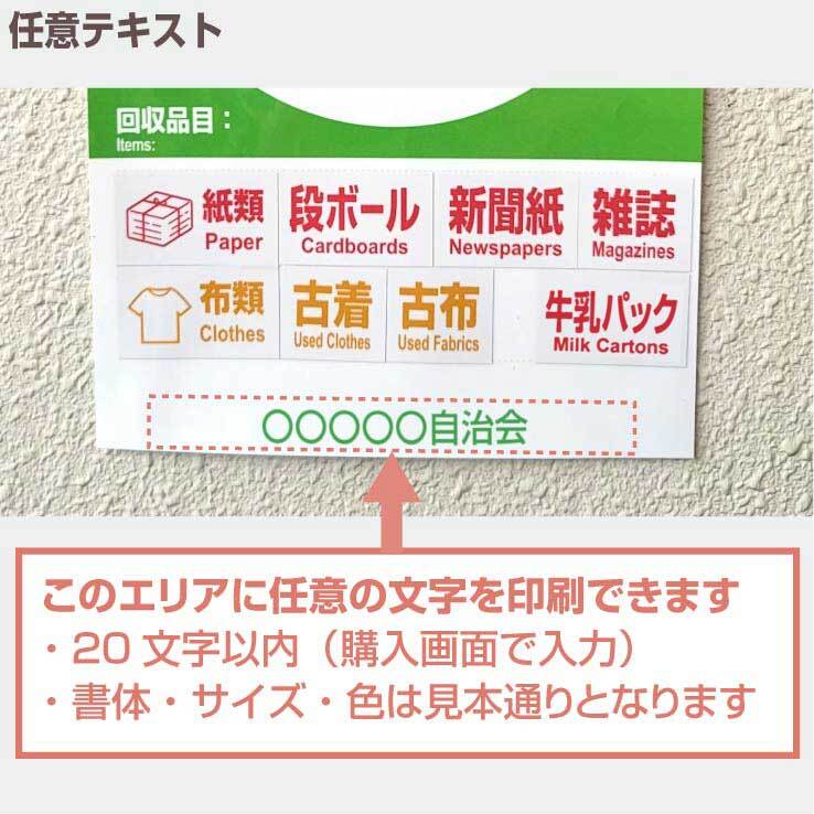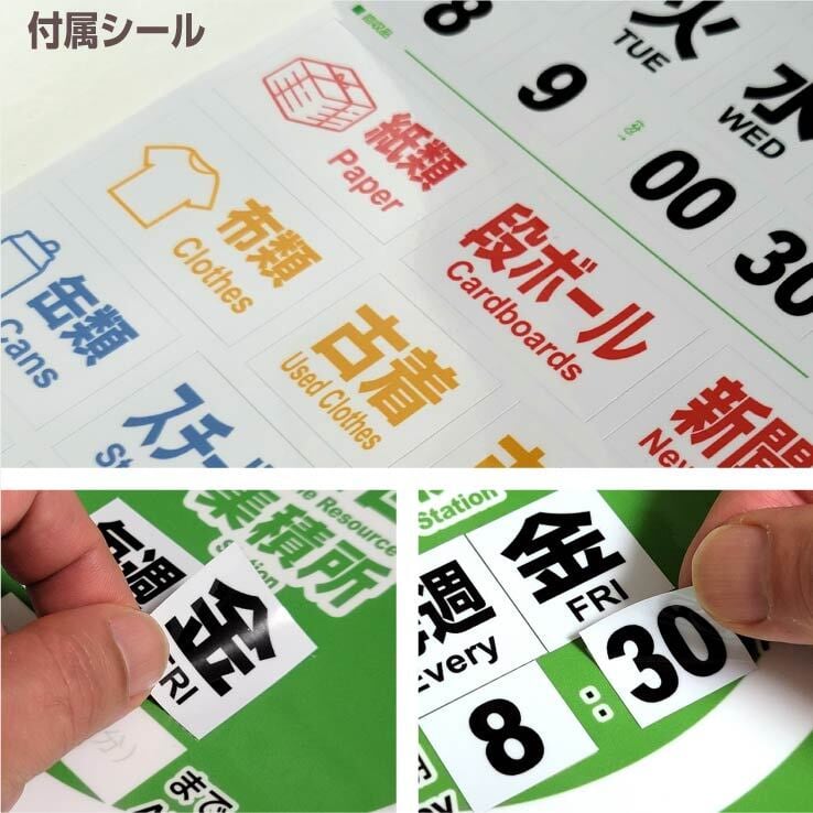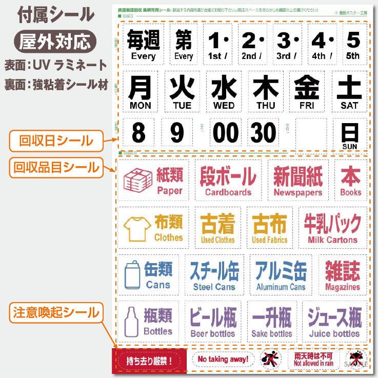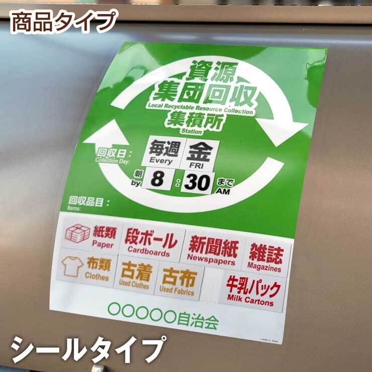 資源集団回収の条件に該当する【回収日】(毎週水、第2・4 土など)や【回収品目】(段ボール、牛乳パック、古布、アルミ缶など)の内容を付属シールの中から選んで、台紙部に貼り付けてご使用ください。