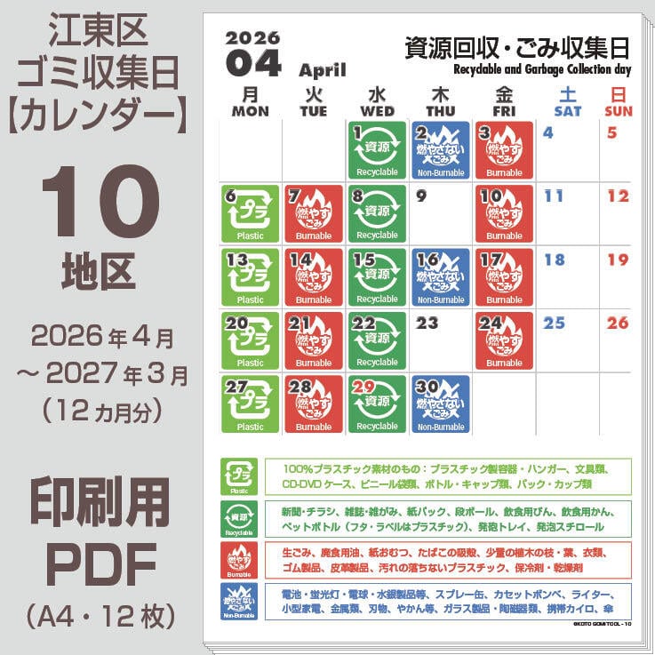 江東区ゴミの日カレンダーPDF(2026年度版)- 10地区