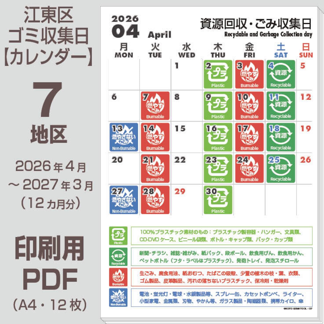 江東区ゴミの日カレンダーPDF(2026年度版)- 7地区