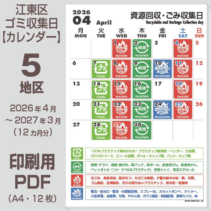 江東区ゴミの日カレンダーPDF(2026年度版)- 5地区