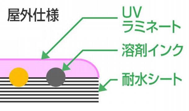 高耐久の屋外用耐水シートに、色あせに強い溶剤インクで印刷。四隅に取付用のハトメ穴が付いています。表面にUVラミネート処理を行うことで日光が当たる屋外でも長期間の使用が可能です。