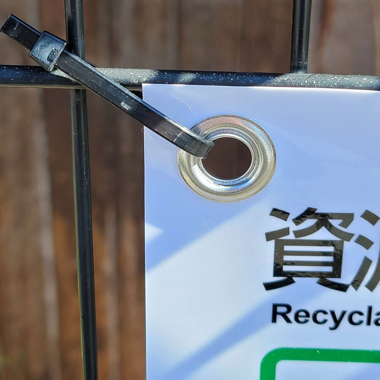 高耐久の耐水シートに、色あせに強い溶剤インクで印刷。四隅に取付用のハトメ穴が付いています。表面にUVラミネート処理を行うことで日光が当たる屋外でも長期間の使用が可能です。