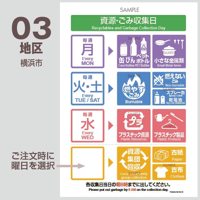 03地区- 横浜市ゴミの日 耐候性ポスター【燃やすごみ→火・土】【プラスチック→水】【缶 びん ペット→月】